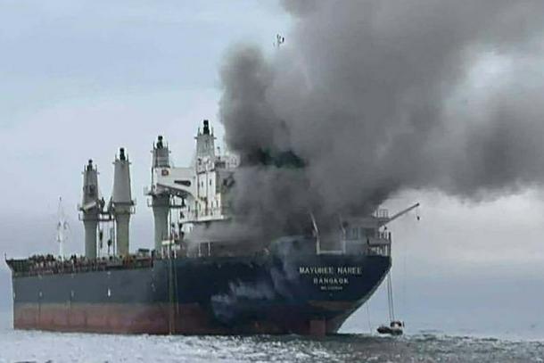 This handout photo taken on March 11, 2026 and released by the Royal Thai Navy shows smoke rising from the Thai bulk carrier 'Mayuree Naree' near the Strait of Hormuz after an attack