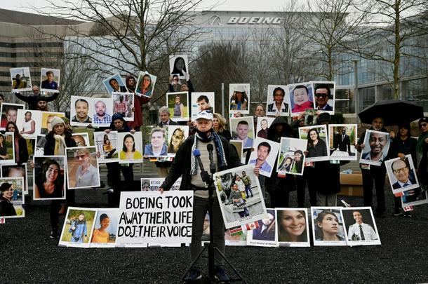 A man stands before photographs of victims of the Boeing 737 MAX crash in Ethiopia in March 2019, at a protest outside the US aircraft manufacturer's office in Arlington, Virginia