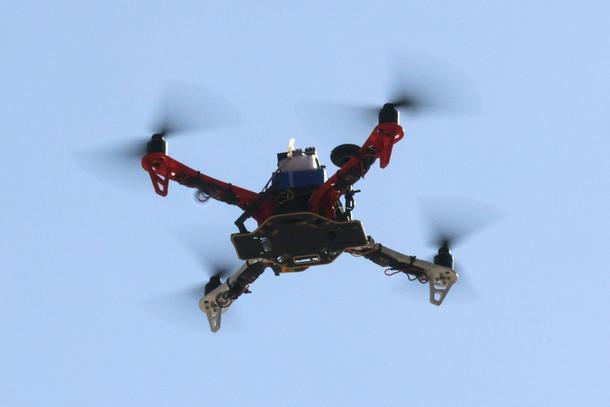 A drone built by engineering students executes a test flight at Iran's Tech Olympics