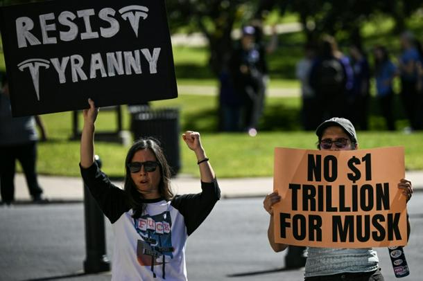 “Elon Musk just got one trillion dollars for failure,” said the group, which rallied against the plan Wednesday in downtown Austin.
