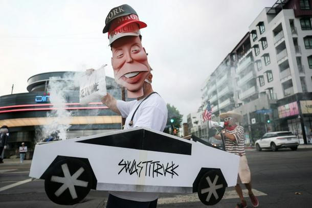 Demonstrators held signs during the 'Tyrant Diner' protest last month against Elon Musk outside of the Tesla Diner and Drive-In Restaurant and Supercharger in Los Angeles