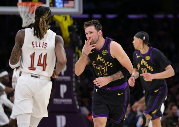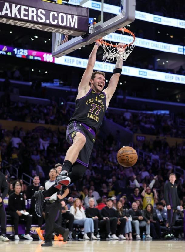 Luka Doncic makes a slam dunk in the Lakers win over Cleveland