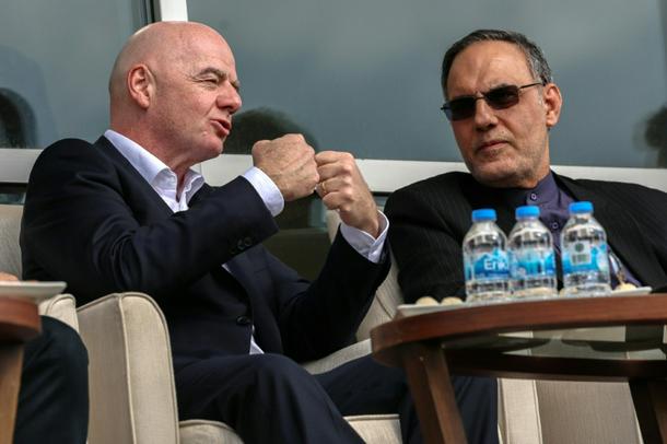 FIFA's President Gianni Infantino (L) makes a point as he watches Iran beat Costa Rica in Antalya, Turkey