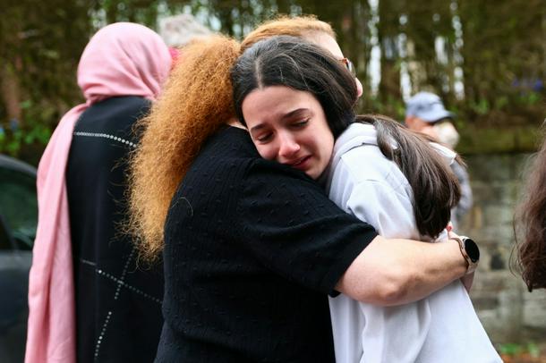 Members of the community comfort each other near Heaton Park Hebrew Congregation Synagogue in Crumpsall, north Manchester, on October 2, 2025, after the attack