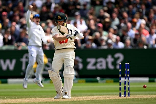 Steve Smith looked to have weathered the storm, but he was cleaned up on nine by Tongue, who knocked back his middle stump to leave England’s “Barmy Army” of fans in full voice.