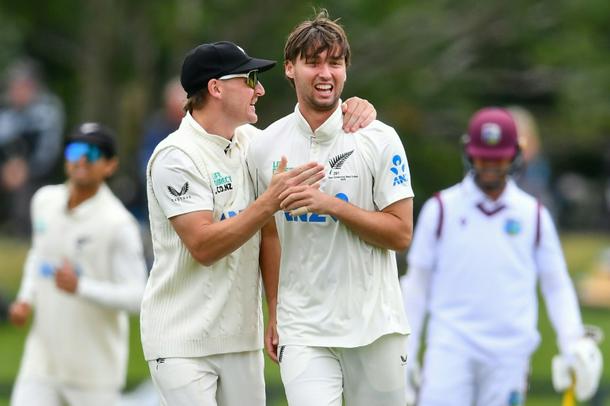 New Zealand's Zak Foulkes (right) is congratulated by his teammate Nathan Smith after taking the wicket of West Indies' John Campbell