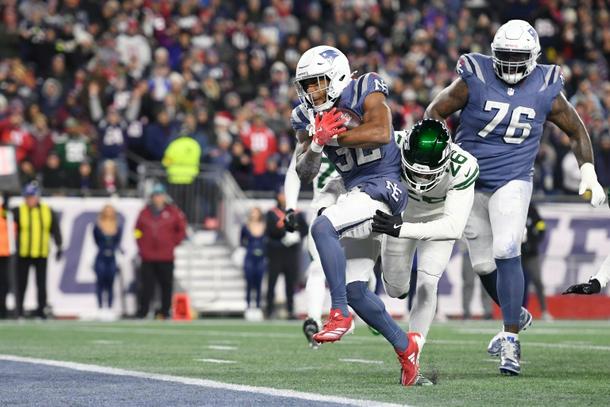 TreVeyon Henderson of the New England Patriots rushes for a touchdown in an NFL victory over the New York Jets