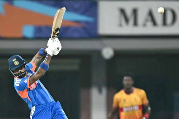 India’s Hardik Pandya plays a shot during the 2026 ICC Men's T20 Cricket World Cup Super Eights match between India and Zimbabwe