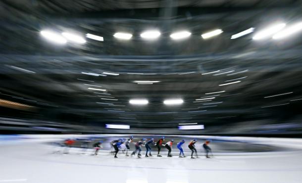 Skaters competing in the Junior World Cup speed skating event, a test event for the 2026 Winter Olympics, on November 30, 2025 in Milan