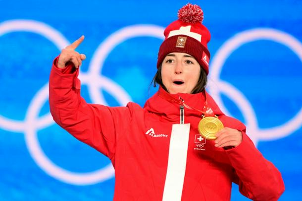 Swiss freestyle skier Mathilde Gremaud celebrates winning slopestyle gold at the Beijing Winter Olympics