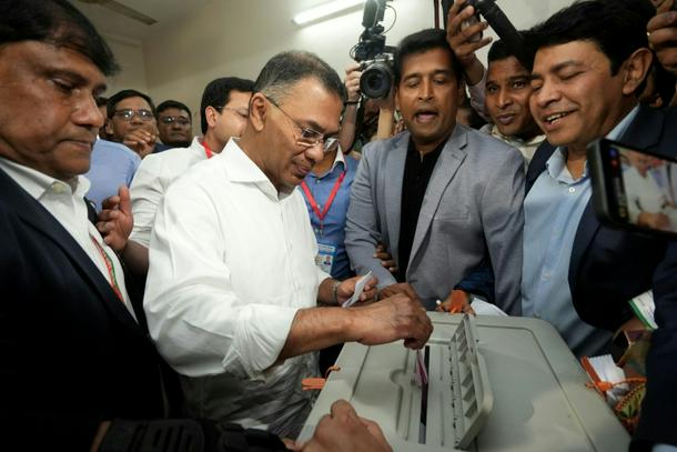 Bangladesh Nationalist Party (BNP) chairman and election candidate Tarique Rahman (C) casts his ballot at a polling station during Bangladesh's general election in Dhaka on February 12, 2026. The BNP is projected to win handsomely in the first elections held since a deadly 2024 uprising
