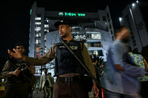 Bangladeshi police personnel stand guard outside The Election Commission office in Dhaka on February 12, 2026, as counting starts following voting in Bangladesh's general election. Polling day was largely peaceful, according to the commission, which reported only "a few minor disruptions"