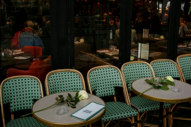 White roses at La Bonne Biere, one of the targets of the attacks