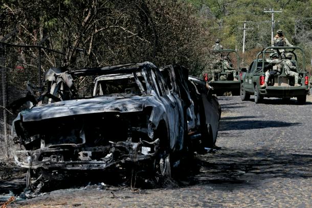 Members of the military are seen next to a burned car used to block roads while Mexican drug lord "El Mencho" tried to flee
