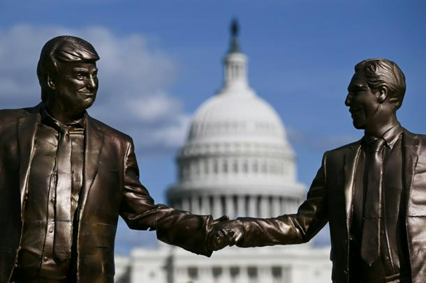 A statue depicting US President Donald Trump holding hands with sex offender Jeffrey Epstein is seen near the US Capitol on October 2, 2025