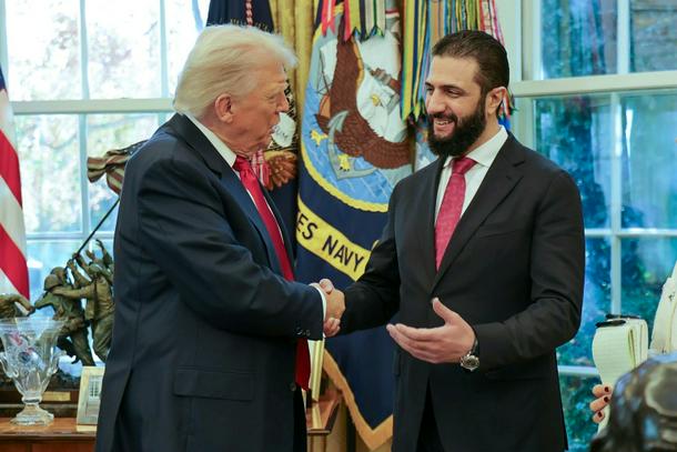 It published photos of Trump standing and shaking hands with a smiling Sharaa beside the Resolute Desk in the Oval Office.