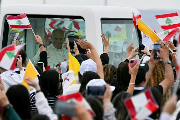 Arriving for the service on the last day of his trip, the pope wound his way through the crowd in his popemobile as people offered roses, with senior officials including President Joseph Aoun also in attendance.