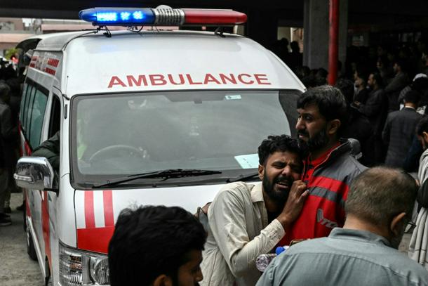 Victims' relatives and survivors of the deadly mosque attack mourned outside an Islamabad hospital where many of the injured were brought