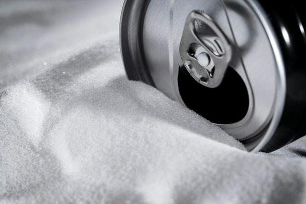 A soft drink can sitting on a bed of sugar. The WHO wants taxes raised on sugary drinks