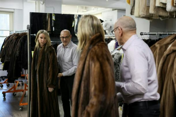 Owner of Madison Avenue Furs Larry Cowit assists a customer in his store, which has seen an uptick in interest in vintage fur in recent years