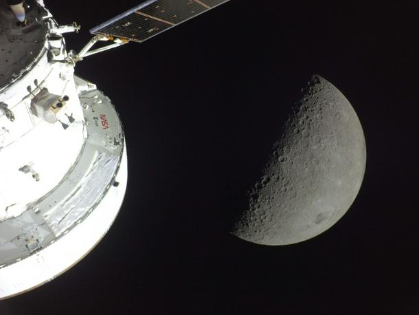 This handout picture released by NASA on April 7, 2026, shows the Orion spacecraft (L) and the Moon (R) on April 6, 2026