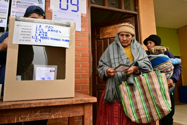 An Aymara woman prepares to cast her vote during the presidential runoff election, in Laja, some 30 km west of La Paz, on October 19, 2025