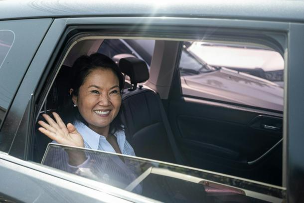 Keiko Fujimori, the frontrunner in Peru's presidential election, waves as she leaves her office in Lima