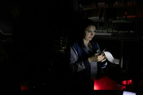 A cashier works in a supermarket during a power outage in the town of Lozova, Kharkiv region, on October 16, 2025, amid the Russian invasion of Ukraine.