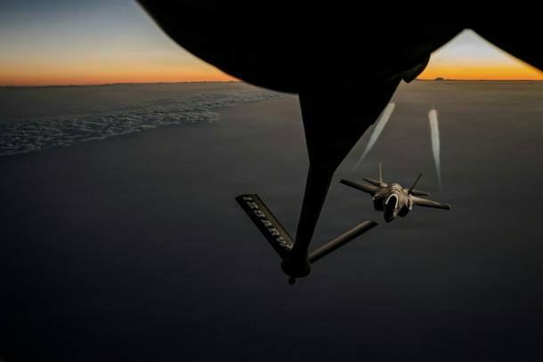 A US Air Force KC-135 Stratotanker aircraft refuels a F-35A Lightning II aircraft during Operation Epic Fury